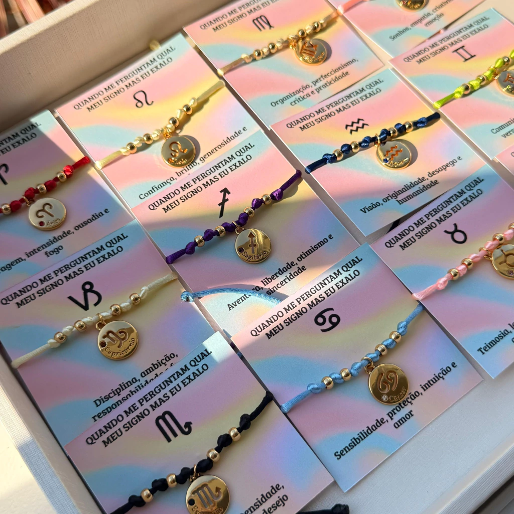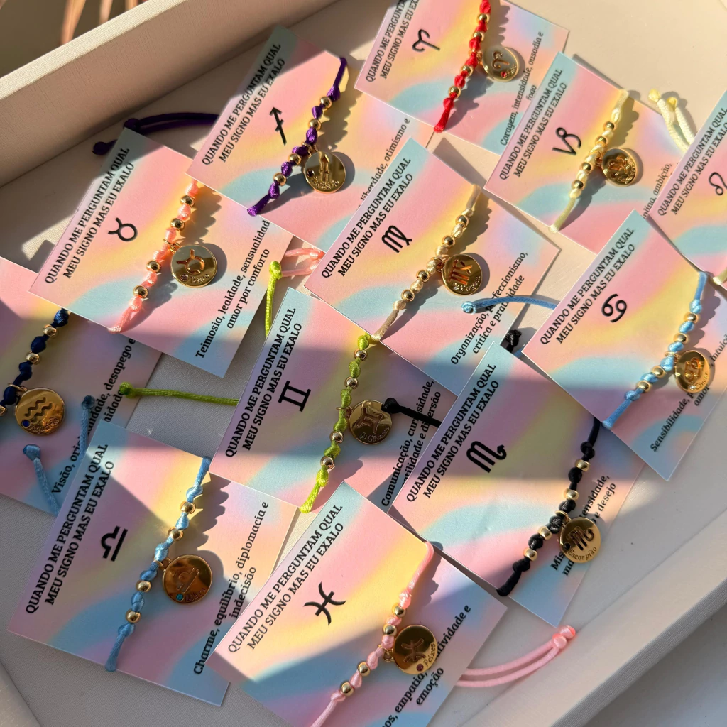Descubra a Pulseira Signos, um acessório exclusivo que traz todos os signos do zodíaco, cada um representado por uma cor diferente. Ideal para quem gosta de expressar sua personalidade e conexão com o universo de forma estilosa e colorida.